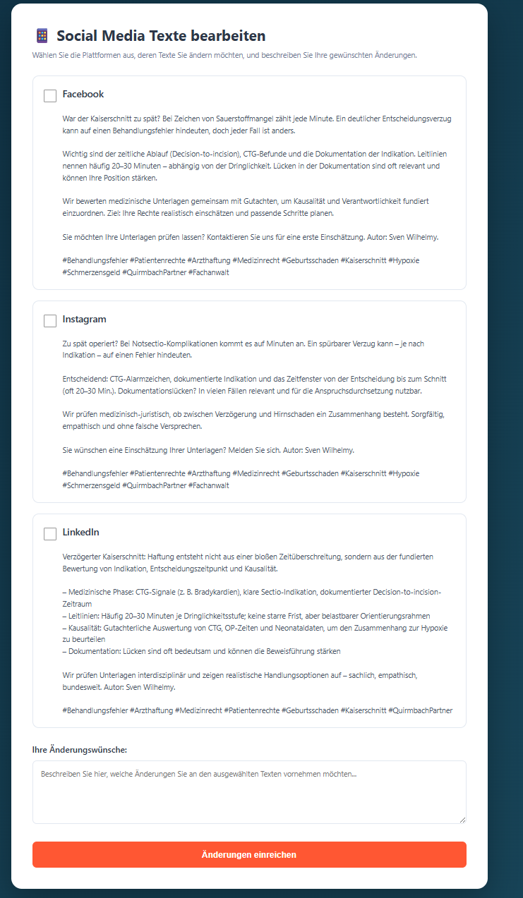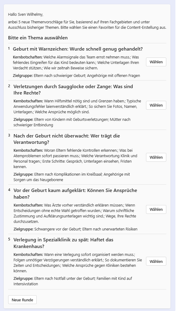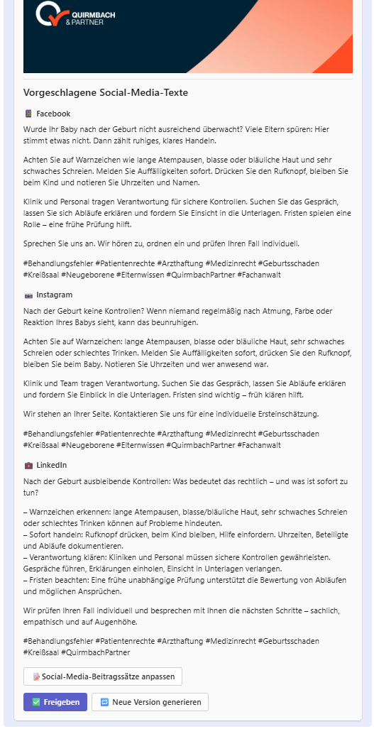 Die KI kennt Ihr Fachgebiet (z.B. Arzthaftungsrecht, Verkehrsrecht) und arbeitet mit unseren Social Media Guidelines. Die Themen passen automatisch zu Ihrer Expertise.