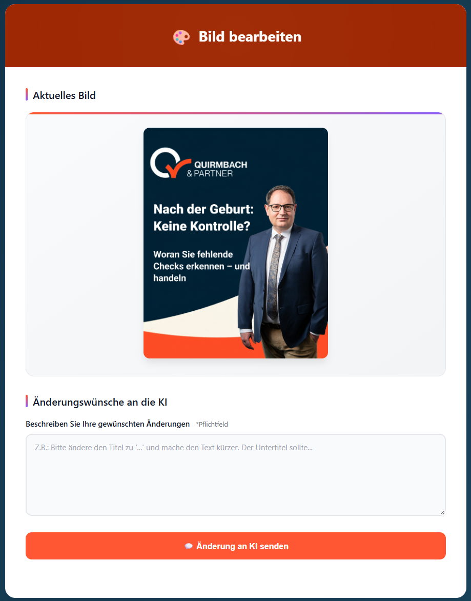 Wenn Sie ein Bild ändern, prüft die KI automatisch, ob die Social Media Texte noch passen. Falls nötig, werden die Texte automatisch angepasst.