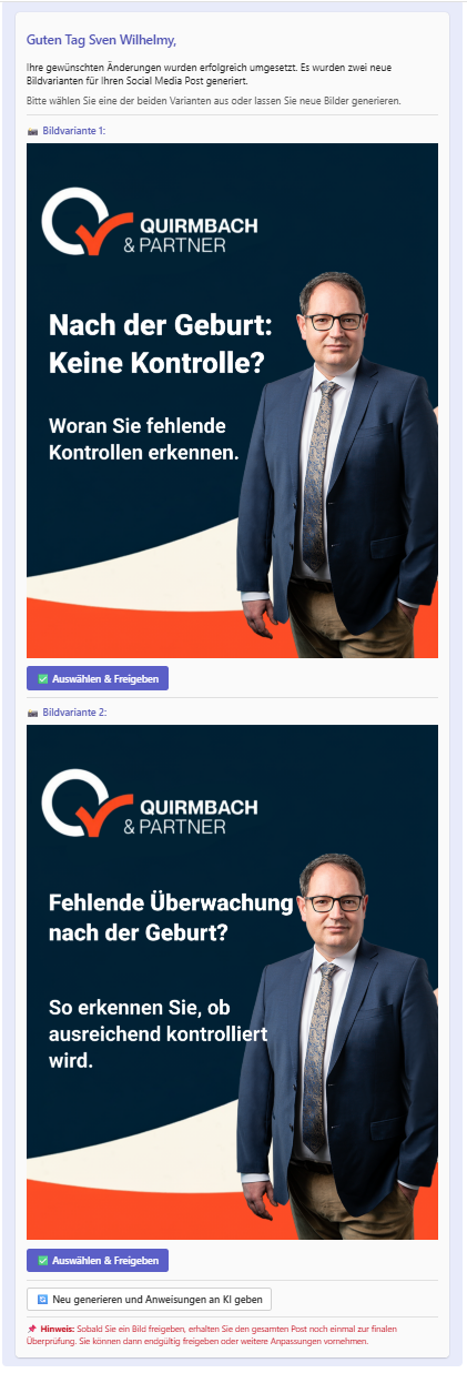 Die KI erstellt jetzt den kompletten Post mit Bildern und Texten. Das dauert 2-4 Minuten. Sie können in der Zwischenzeit weiterarbeiten – Sie bekommen eine neue Teams-Nachricht, sobald der Post fertig ist.